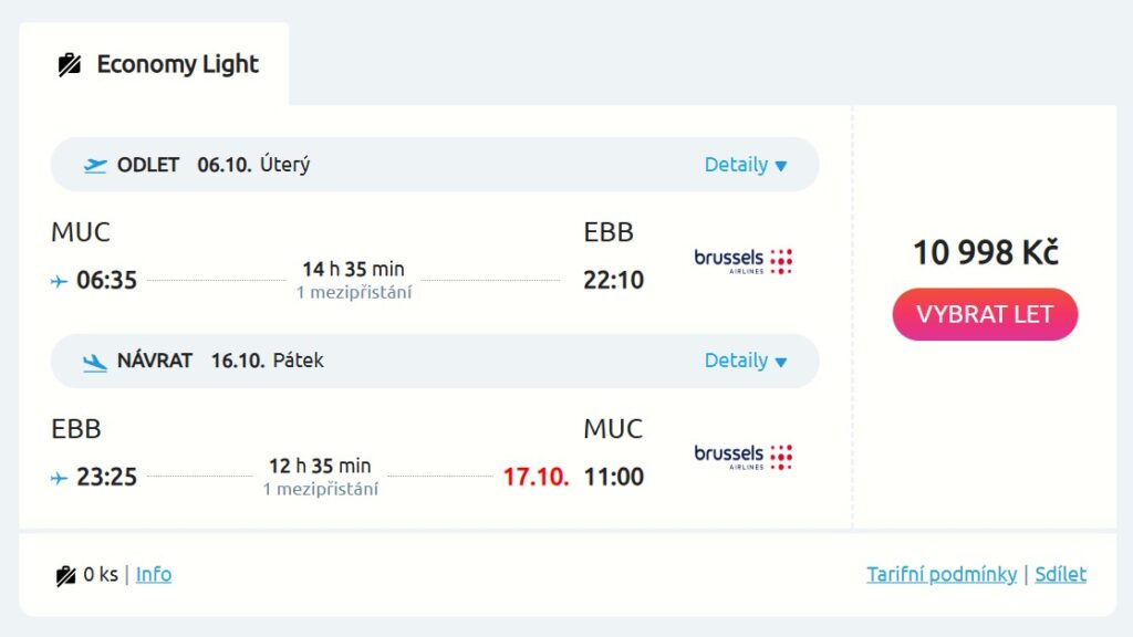 Divoká Afrika volá! Tak se nech zlákat pěknými letenkami z Mnichova do Ugandy a vydej se nejen za pozorováním majestátních goril. Zpáteční letenky do města Entebbe nabízí belgická aerolinka Brussels Airlines za 10 998 Kč. Na výběr máš ze spousty termínů od března do května a poté od září do prosince. Tak se mrkni třeba na náš příkladový termín od 6. do 16. října. Po cestě tě v obou směrech čeká jeden pohodový přestup v Bruselu.