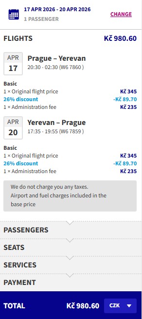 Levné letenky jsou dostupné prakticky na všech letech od ledna až do dubna. Zpáteční letenky z Prahy (PRG) do Jerevanu (EVN) ulovíš od 980 Kč, a to např. v termínu od 17.  do 20. dubna 2026. Na nejnižší ceny tradičně dostanou členové věrnostního programu Wizz Discount Club, zatímco ostatní cestovatelé si pár stokorun připlatí.
