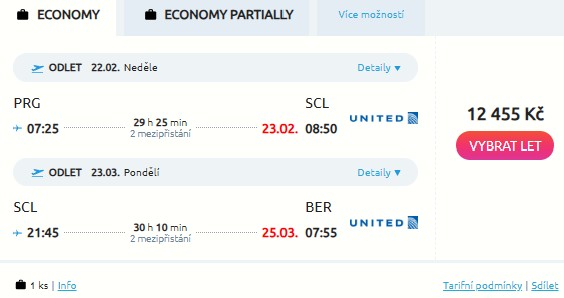 Další várka akčních letenek do Chile je v limitovaném množství dostupná v nabídce letecké společnosti United Airlines. Open-jaw letenky s odletek z Prahy (PRG) do Santiaga de Chile (SCL) a návratem z hlavního města této jihoamerické země do Berlína (BER) startují na 12 455 Kč. Základní tarif umožňuje bezplatně přepravit také odbavené zavazadlo s limitem 23 kg. Cestou na jihoamerický kontinent i zpět do Evropy tě vždy čekají dva přestupy – v německém Frankfurtu (FRA) či na území USA v Houstonu (IAH) a New Yorku-Newarku (EWR).