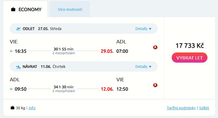 Náhled letenky z Vídně do Adelaide za 17 733 Kč