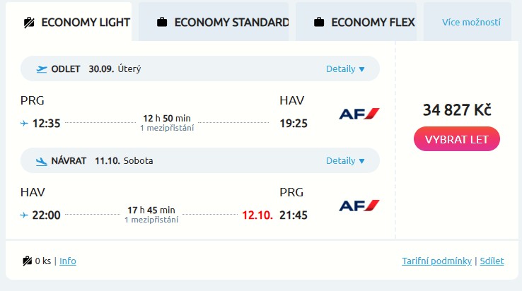 Opět ti přinášíme exkluzivní nabídku zpátečních letenek z Prahy na Kubu. Máme pro tebe letenky ze skupinové rezervace, kdy je u nás máš za parádních 10 990 Kč / ks, a to včetně odbaveného báglu do 23 kg. Termíny jsou fixní, a to od 30. září do 12. října (2 ks) nebo od 4. do 15. října (6 ks). Poletíš na křídlech aerolinky Air France a po cestě tě čeká jeden přestup v Paříži (CDG). Pro úplnost dodáme, že aktuální cena totožné letenky v rezervačním systému dopravce je téměř 35 tisíc Kč.