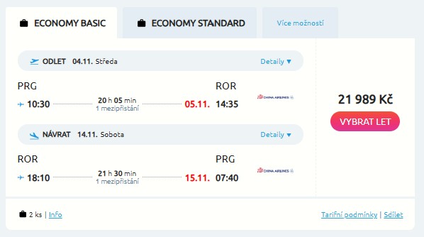 Pacifické Palau je naprostý unikát a kromě potápění v křišťálově čistých lagunách mezi mořskými živočichy ti toho nabídne mnohem více. Přesvědč se o tom na vlastní oči díky letenkám od aerolinky China Airlines. Na jejích křídlech poletíš na letiště Koror (ROR) jednoduše z Prahy (PRG) a zpáteční cesta tě vyjde na 21 989 Kč. Ve všech případech máš v ceně hned dvě odbavená zavazadla do 23 kg. Na výběr máš ze spousty termínů od září až do června příštího roku. Po cestě tě v obou směrech čeká jeden pohodlný přestup na moderním letišti v Tchaj-peji.