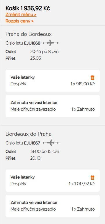 V ceně letenky máš zahrnutý příruční bágl o rozměrech do 45 × 36 × 20 cm. Větší kabinový bágl si přikoupíš od 659 Kč za jeden směr a odbavené zavazadlo do 15 kg je tvoje od 872 Kč za směr.
