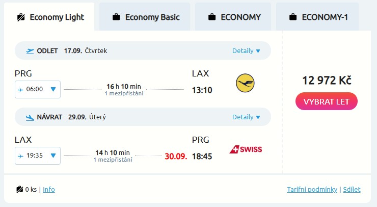 Opět ti přinášíme tip na pěkné letenky do oblíbené Kalifornie, tentokrát do hvězdného Los Angeles. Zpáteční letenky z Prahy nabízí aerolinky Lufthansa ve spolupráci se Swiss a Austrianem a tvoje jsou za sympatických 12 972 Kč. Kratší i delší termíny ulovíš od dubna až do listopadu, a to včetně státních svátků. Tak si užij dechberoucí národní parky na západě USA třeba od 17. do 29. září. Po cestě tě čeká vždy jeden přestup, a to buď v Mnichově, Frankfurtu, Curychu či Vídni. Navíc poletíš-li přes Frankfurt, dálkový let strávíš na palubě legendárního Boeingu 747, via Mnichov si vychutnáš let s Airbusem A380!