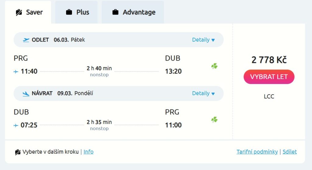 Základní tarif „Saver“ zahrnuje přepravu odbaveného zavazadla do 10 kg (lze si ho vzít i s sebou do kabiny za příplatek od 10 €) a na palubu s sebou můžeš vzít osobní věc, která se vejde pod sedadlo před tebou. Větší zavazadlo k odbavení do 20 kg si přikoupíš za cca 1 100 Kč v jednom směru.