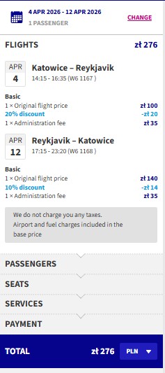 Se skončením přímé linky z Prahy na Island od aerolinky Play musíme za levnými letenkami k našim sousedům. Tak využij nabídky od aerolinky Wizz Air a leť na nádherný Island z Katovic s letenkami od 1 589 Kč. Na nejnižší ceny klasicky dosáhnou pouze členové Wizz Discount Clubu při nákupu na webu dopravce, ostatní si připlatí pár kaček. K mání jsou termíny v březnu a dubnu, včetně Velikonoc – mrkni se na náš příkladový termín od 4. do 12. dubna a vychutnej si Island plnými doušky s ušetřeným dnem volna.
