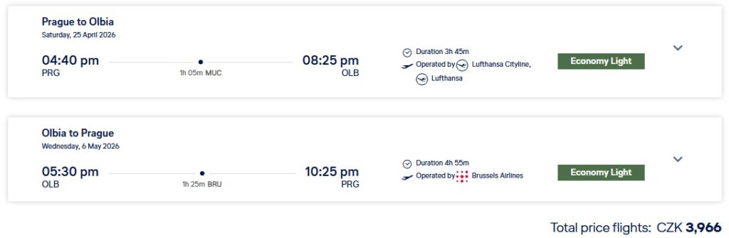 Nádherná Sardinie, druhý největší ostrov ve Středozemním moři, nadchne milovníky pláží, hor i skvělého jídla. Tak si naplánuj letošní dovolenou na Sardinii díky pěkným letenkám z Prahy do Olbie, které nabízí aerolinka Lufthansa se svými partnery ze Star Alliance. Cena za zpáteční letenky startuje na 3 966 Kč v kratších i delších termínech od dubna do září, a to i přes květnové svátky a letní prázdniny. Tak leť létu naproti třeba od 25. dubna do 6. května. Po cestě tě čeká jeden přestup v Mnichově, Frankfurtu, Bruselu či Curychu.