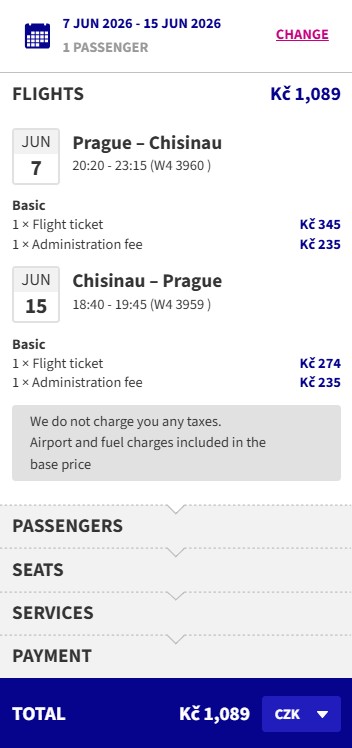 Neseď doma, vydej se na průzkum tajemného Moldavska, kde bys turistu zatím pohledal. Zpáteční letenky do Kišiněva z Prahy nabízí maďarská aerolinka Wizz Air na přímých letech za pěknou cenu, která startuje na 1 089 Kč. Dostupné jsou kratší i delší termíny během jara, konkrétně od dubna do června. Tak co vyrazit do Moldavska třeba od 7. do 15. června? Klasicky platí, že na nejnižší ceny dosáhnou členové Wizz Discount Clubu při nákupu na webu dopravce – ostatní si ale připlatí jen pár korun.