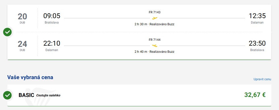 Objev krásy tureckého pobřeží na Egejské riviéře. Díky irské letecké společnosti Ryanair se z Bratislavy (BTS) do Dalamanu (DLM) dostaneš již za cenu romantické večeře pro dva, tedy 800 Kč, a to např. v termínu od 20. do 24. dubna 2026. Linka je provozována dvakrát týdně, vždy v pondělí a v pátek, takže ji lze snadno využít i ke krátkému výletu na prodloužený víkend (odlet v pátek večer / návrat v pondělí odpoledne).