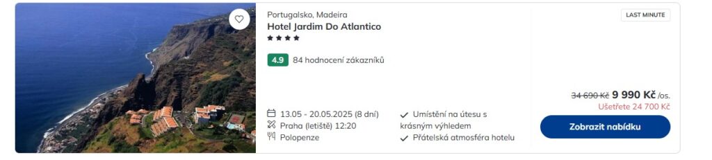 Odleť na ostrov věčného jara za pár dní! Cestovní kancelář Čedok aktuálně nabízí last minute zájezdy z Prahy na Madeiru už od 11 990 Kč. V ceně máš zpáteční letenky, ubytování ve čtyřhvězdičkovém hotelu, transfery, českého delegáta a stravování podle výběru ubytování. Zájezdy jsou dostupné s odletem 13. května a návratem 20. května. O lety se postará domácí aerolinka Smartwings a v balíčku jsou zahrnuty příruční i odbavené zavazadlo.