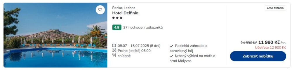 Cestovní kancelář Čedok přichází s novou várkou prázdninových zájezdů do Řecka. Už příští týden si můžeš užívat krásné pláže a výtečnou kuchyni na ostrově Lesbos, kam odletíš na týden z Prahy v úterý ráno. Cena balíčků startuje na 11 990 Kč, kdy budeš bydlet ve tří- nebo čtyřhvězdičkovém hotelu se snídaní nebo polopenzí, poletíš přímým letem s aerolinkou Smartwings a vezmeš si s sebou odbavený bágl do 23 kg. Nemusíš řešit ani transfery na místě a k dispozici ti bude česky mluvící delegát po celou dobu pobytu.