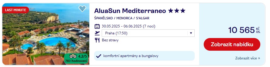 Každý zná populární Mallorcu, ale sousední Menorca rozhodně také stojí za povšimnutí. Nejlevněji se na druhý největší z Baleárský ostrovů dostaneš v rámci zájezdu, kdy moc pěkné ceny nyní nabízí cestovní kancelář TUI. Last minute zájezd z Prahy na Menorcu pořídíš od 10 565 Kč, a to na přelomu května a června (týdenní pobyt). V balíčku máš přímý let operovaný aerolinkou Smartwings, odbavený bágl, ubytování, různé typy stravování, transfery na místě a služby česky mluvícího delegáta.