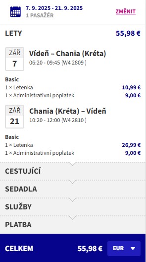 Dlouhá zima je před námi, ale ty už máš možnost ulovit si levné letenky na příští léto. Skvělou destinací pro letní dovolenou je nádherná Kréta, která uspokojí plážové povaleče, milovníky historie i nadšené průzkumníky hor a soutěsek. Aerolinka Wizz Air nabízí zpáteční letenky z Vídně na Krétu, na letiště Chania alokované na západě ostrova, které tě vyjdou od 1 413 Kč. Klasicky platí, že na nejnižší ceny dosáhnou pouze členové Wizz Discount Clubu při nákupu na stránkách dopravce. Pokud poletíš alespoň s jedním dalším parťákem, členství se ti vyplatí při první zpáteční letence. Za fajn ceny pořídíš letenky od konce července až do konce září – tak si zaleť na Krétu třeba od 7. do 21. 9.