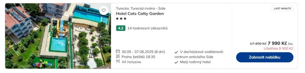 Pokud se poohlížíš po destinaci, kde si vychutnáš pořádnou dávku tepla a koupačku, sáhni do nabídky cestovní kanceláře Čedok. Čekají tam na tebe all inclusive zájezdy do Turecka z Prahy i Ostravy, a jejich cena začíná na 7 990 Kč. Součástí balíčku je ubytování ve tří- nebo čtyřhvězdičkovém hotelu, přímý let operovaný aerolinkou Smartwings na letiště v Antalyi, odbavený bágl, transfery na místě a služby česky mluvícího delegáta. Odlety z Prahy na týden připadají na příští pátek a z Ostravy poletíš o den později.