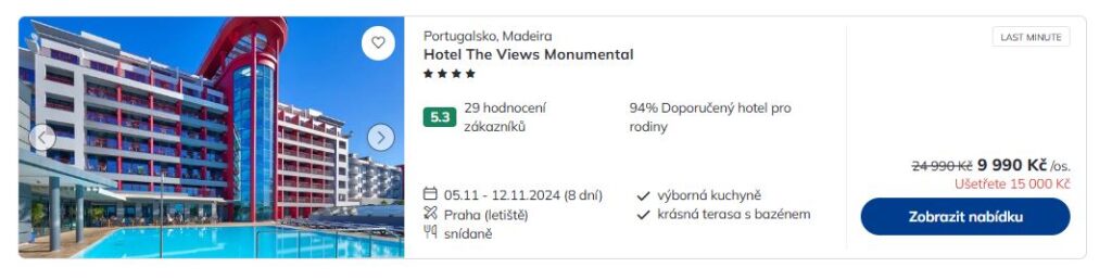 Pondělní ráno nás přivítalo prvními mrazíky. Pokud příchod zimy odmítáš akceptovat, uteč před ním na Madeiru. V nabídce cestovní kanceláře Čedok pořídíš last minute zájezdy z Prahy na Madeiru s odletem zítra v poledne za skvělé ceny od 9 990 Kč! Na místě tě čeká týdenní pobyt v pěkném čtyřhvězdičkovém hotelu The Views Monumental se snídaní v ceně. Za příplatek ve výši jedné tisícovky je možné nalézt zázemí během pobytu na portugalském ostrově v 5* Hotelu Melia Madeira Mare.