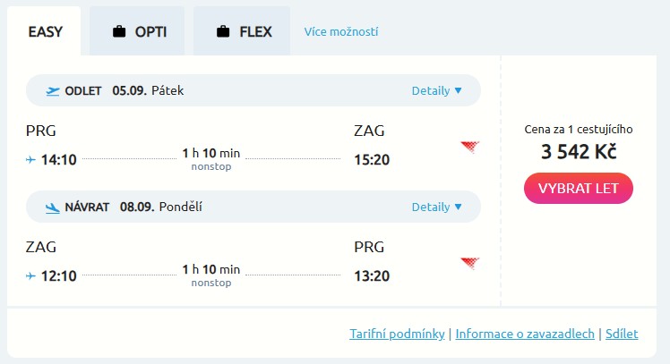 S blížícím se létem přichází také nálož pěkných letenek do oblíbeného Chorvatska. Nabídka je letos navíc obohacená o přímé lety do tamějšího hlavního města, a to díky aerolince Croatia Airlines. Díky ní si zaletíš do Chorvatska z Prahy od 3 542 Kč, a to konkrétně do Dubrovníku, Splitu a Záhřebu. Nakombinovat si můžeš také open-jaw letenky. Termíny jsou dostupné od května do října letošního roku, včetně letních prázdnin. Tak omrkni třeba Záhřeb na prodloužený víkend od 5. do 8. září.