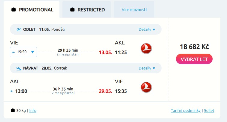 Náhled letenky z Vídně do Aucklandu za 18 682 Kč