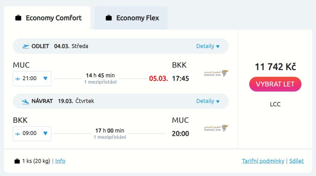 Levné letenky do Thajska nikdy neomrzí, tak si nenech uletět pěknou nabídku od aerolinky Oman Air. Zpáteční lupeny z Mnichova do Bangkoku jsou tvoje za parádních 11 740 Kč, a to včetně odbaveného zavazadla. Termíny jsou k mání od března do května příštího roku, tak si zaleť do tepla například od 4. do 19. března. Po cestě tě čeká jeden pohodový přestup v Maskatu.
