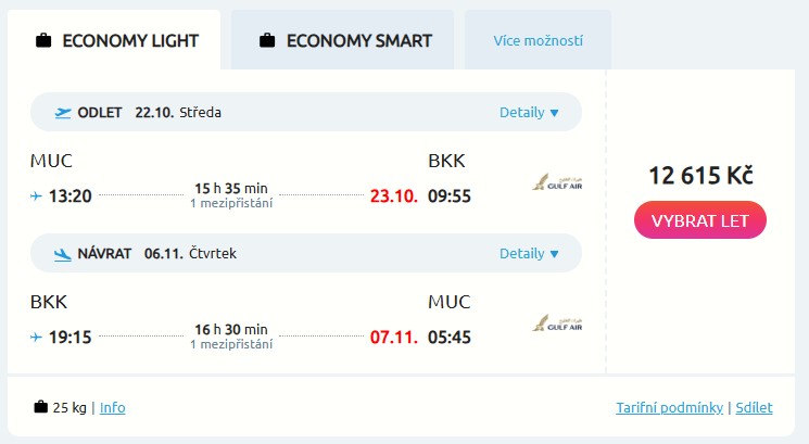 Konkurenční boj aerolinek z Arabského poloostrova, který tlačí dolů ceny letenek, potěší tradičně cestovatele – a obzvlášť ty, kteří by se rádi vypravili do oblíbeného Thajska. Zpáteční letenky z Mnichova do Bangkoku pořídíš u aerolinky Gulf Air za 12 615 Kč a u aerolinky Saudia za 12 736 Kč. Na výběr máš z pestré palety termínů od srpna až do května příštího roku, stačí, když se mrkneš do našich přehledných kalendářů níže. Tak se vyprav za těmi nejkrásnějšími plážemi a lahodným jídlem například od 22. října do 6. listopadu. Po cestě tě vždy čeká jeden přestup – v případě letů s Gulf Air v Bahrajnu a se Saudií budeš přestupovat v Džiddě nebo Rijádu.