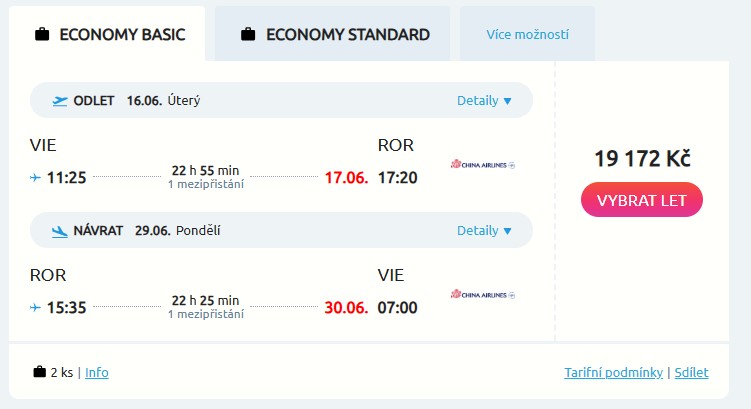 Sbal si šnorchl a vydej se do ráje potápěčů. Pěkné letenky na souostroví Palau v Oceánii opět nabízí tchaj-wanská aerolinka China Airlines. Z Vídně poletíš za parádních 19 172 Kč a z Prahy jen o trochu dráž za 21 709 Kč. Termíny jsou dostupné od března do června a pak od září do prosince, máš tedy opravdu z čeho vybírat. Tak co třeba od 16. do 29. června? Po cestě tě čeká jeden pohodový přestup na letišti v Tchaj-peji.