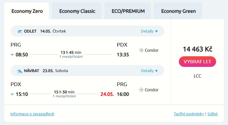 Vydej se do méně profláklnutého amerického státu Oregon na křídlech německé aerolinky Condor. Ta totiž nabízí zpáteční letenky z Prahy do Portlandu, které jsou tvoje za fajnových 14 463 Kč. Na severozápad Spojených států poletíš v termínech během května, června a září – tak co třeba od 14. do 23. května? Po cestě tě čeká jeden přestup na letišti ve Frankfurtu, a to v obou směrech.