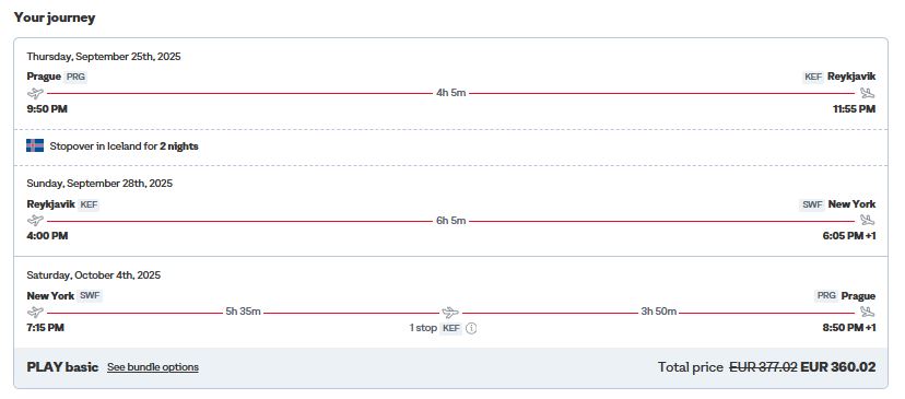 Levné letenky z Prahy do New Yorku si pro všechny lowcostové cestovatele připravila islandská nízkonákladová aerolinka Play. V její aktuální nabídce ulovíš zlevněné zpáteční letenky z Prahy (PRG) do New Yorku, na letiště Stewart (SWF), za 8 354 Kč. Základní tarif „Basic“ zahrnuje pouze bezplatnou přepravu malého příručního zavazadla. Ve směru do Spojených států amerických tě čeká delší layover na Islandu, který využiješ k nocování v Reykjavíku a následně jeho půldenní prohlídce. Zpáteční routing obsahuje také 10hodinový přestup na jihu ostrova (jedná se však už o čistě denní záležitost, kdy doženeš, cos během cesty do USA nestihl/a).
