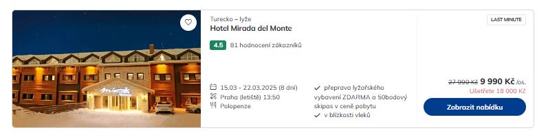 Poslední možnost, jak využít lyžařské zájezdy z Prahy do Turecka během letošní zimní sezony, máš nyní u cestovní kanceláře Čedok. V sobotu bude totiž vypravena úplně poslední rotace na lince mezi Prahou a tureckým městem Kayseri, kterou CK pro přepravu svých klientů využívá. Balíčky last minute zájezdů na lyže z Prahy do Turecka pořídíš od 9 990 Kč! Na místě tě čeká týdenní ubytování ve tříhvězdičkovém Hotelu Mirada del Monte s polopenzí v ceně. Případně si lze vybrat také pětihvězdový Hotel Mirada del Lago, a to s příplatkem ve výši 4 tisíc Kč.