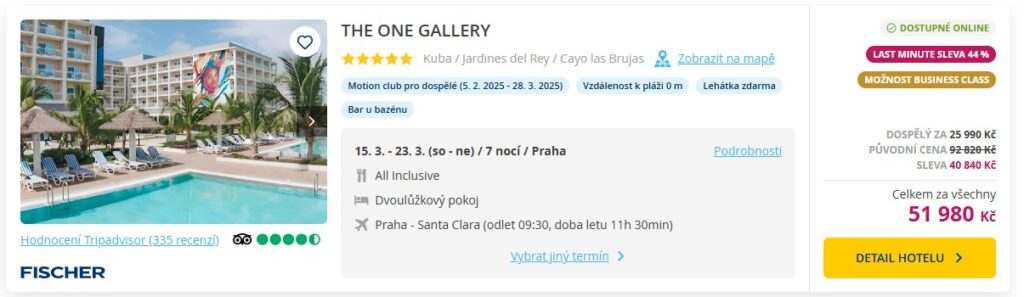 Hledáš místo, kam odletíš za odpočinkem do tepla? Využij posledních zájezdů sezóny na dalekou Kubu z Prahy. V last minute nabídce od cestovní kanceláře Fischer ulovíš all inclusive zájezdy od skvělé ceny 25 990 Kč. Bydlet budeš ve čtyř- nebo pětihvězdičkovém hotelu v okolí města Santa Clara, kam odletíš už tuto sobotu. V ceně máš také, kromě ubytování a stravy, přímý let s aerolinkou World2Fly, odbavený bágl, transfery na místě a služby česky mluvícího delegáta.