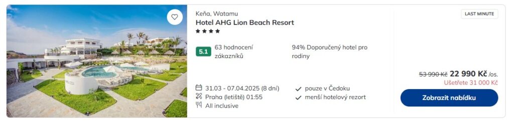 Cestovní kancelář Čedok po celkem dlouhé době nabízí pěkné ceny zájezdů do africké Keni z Prahy. Poslední termín sezóny pořídíš za 22 990 Kč, a vychází od 31. března do 7. dubna. Bydlet budeš ve čtyřhvězdičkovém hotelu AHG Lion Beach Resort, který se nachází přímo na pobřeží Indického oceánu v letovisku Watamu. V ceně máš také stravování formou all inclusive, lety operované aerolinkou Smartwings do Mombasy, odbavený bágl, transfery na místě a služby česky mluvícího delegáta.