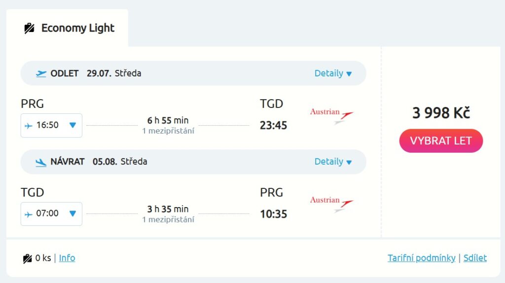 Zaleť si na prázdniny za teplem a tyrkysovým mořem do Černé Hory. Zpáteční letenky z Prahy do Podgoricy nabízí aerolinka Austrian Airlines za parádních 3 998 Kč. Za tuto cenovku pořídíš velmi atraktivní termíny od druhé poloviny července a během celého srpna, tak leť ochutnej Balkán během léta třeba od 29. července do 5. srpna. Po cestě tě čeká jeden přestup na letišti ve Vídni.