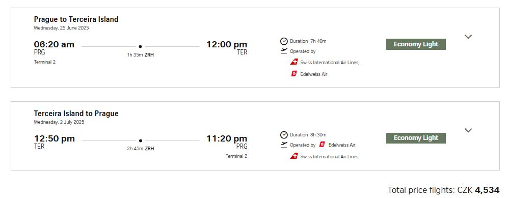 Základní tarif „Economy Light“ zahrnuje přepravu klasického velkého příručáku a navíc i menší báglu v podobě osobní věci. Pokud potřebuješ cestovat se zavazadlem k odbavení, kup si letenky rovnou ve vyšším tarifu „Economy Classic“ s příplatkem cca 800 Kč / směr. V obou směrech tě čeká jeden přestup ve švýcarském Curychu (ZRH). Segmenty mezi Prahou a Curychem operuje letecká společnost Swiss (resp. Airbusy A220-300 zapůjčené od Air Baltic), zatímco lety mezi Švýcarskem a Azorskými ostrovy dceřiná aerolinka Edelweiss Air.
