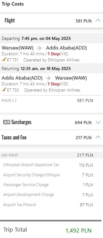 Poslední akční letenky do Etiopie, mimochodem se jednalo o tuto pecku v „business class“ za 6 tisíc Kč, bohužel neprošly verifikací aerolinky Aegean Airlines, která se vymluvila na chybně naceněné tarify a letenky zrušila. Pokud už ses těšil/a na výlet do Etiopie, máme pro tebe alespoň malou náplast v formě dalších zajímavých letenek do tamějšího hlavního města – tentokrát od Ethiopian Airlines. Zpáteční letenky z Varšavy (WAW) do Addis Abeby (ADD) pořídíš za 8 704 Kč. Prakticky se jedná o nejrychlejší spojení ze střední Evropy do Etiopie. Dopravce totiž nabídne přímé lety (čeká tě pouze technické mezipřistání ve Vídni, kde ale nebudeš opouštět palubu letadla).