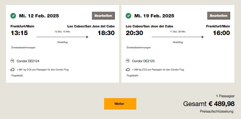 Využij zlevněných letenek na nejdelší lince německé aerolinky Condor a vydej se na jeho jejích křídlech do Mexika. Zpáteční letenky na přímých letech z Frankfurtu (FRA) do San José del Cabo (SJD) ležícího v mexickém státě Baja California Sur ulovíš za ceny od 12 289 Kč. Spojení je operováno 2× týdně (středa a neděle) až do konce dubna. Za lákavé ceny je dostupné velké množství letenek v druhé polovině února, březnu i dubnu.
