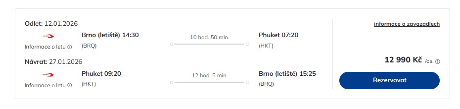 - 20. 1. či 27. 1. Phuket – Brno -> 09:20 – 15:25