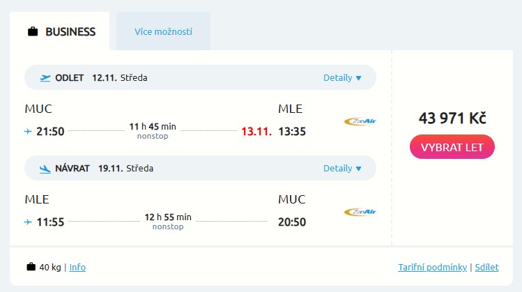 Chceš zažít nevšední cestu a letět přímým letem z Mnichova na exotické Maledivy v letadle, které má pouze business třídu? Tak přesně to ti nabídne aerolinka Beond, která si nyní připravila zpáteční letenky za parádních 43 971 Kč. Na výběr máš ze středečních a nedělních rotací na téměř každý týden od listopadu do března 2026, mimo Vánoce a Nový rok. Tak zažij cestu v luxusu a vychutnej si Maledivy například od 12. do 19. listopadu, kdy využiješ i státního svátku. Po cestě letadlo přistane v Dubaji kvůli dotankování, a to v obou směrech.