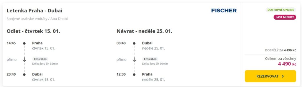 Cestovní kancelář Fischer nám na poslední den v roce naděluje parádní letenky z Prahy do oblíbené Dubaje. A ne jen tak ledajaké – za luxusní cenovku 4 490 Kč poletíš s prémiovou aerolinkou Emirates v termínu od 15. do 25. ledna! Nabídka je omezená, tak neváhej. Alternativně si ulovíš také přímé lety s aerolinkou Flydubai v termínu od 18. do 26. ledna.