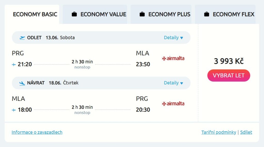 V ceně letenky máš jeden příruční bágl o rozměrech do 40 × 34 × 18 cm. Odbavené zavazadlo do 10 kg máš v ceně ve vyšším tarifu Value, kdy tě zpáteční letenky vyjdou na 4 835 Kč. Během letů je občerstvení a nápoje pouze za poplatek.