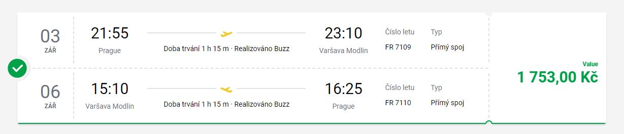 Po dlouhé době jsme se dočkali oznámení nové linky z Prahy v podání nízkonákladové aerolinky Ryanair. Irský dopravce začne červencem počínaje létat na lince z Prahy do Varšavy a bude tuto trasu operovat do závěru října letošního roku. Spojení mezi oběma městy bude provozováno s frekvencí dvou týdenních rotací, a to v pátek a pondělí. Zpáteční letenky se na termíny během letních prázdnin momentálně prodávají za 2 113 Kč (zářijové a říjnové termín za 1 753 Kč). S nákupem nemusíte nikam spěchat, osobně věříme, že ceny letenek z Prahy do Varšavy u Ryanairu klesnou níže než je nabízeno v současné době.