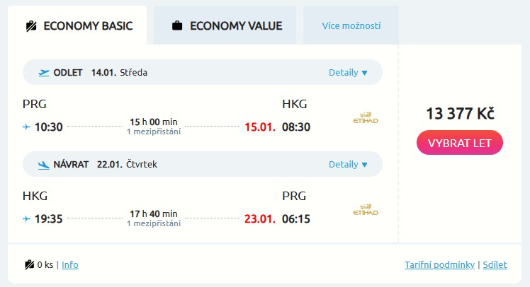 Vydej se do jihovýchodní Asie díky pěkné nabídce skvěle hodnocené aerolinky Etihad Airways. Zpáteční letenky z Prahy do Hongkongu, který je skvělou vstupní branou do regionu, pořídíš za 13 377 Kč. Pohodlné lety povedou přes letiště v Abú Dhabí, kde tě čeká jeden krátký přestup. A termíny? Na výběr máš z široké palety od ledna do června příštího roku, tak co třeba od 14. do 22. ledna?