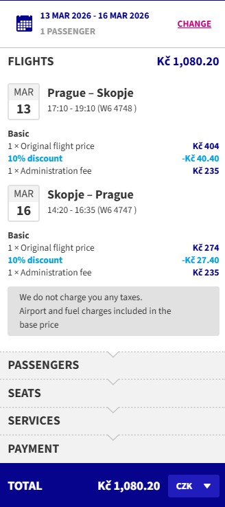 V ceně letenky máš jeden příruční bágl o rozměrech do 40 × 30 × 20 cm. Větší příručák si dokoupíš v rámci služby Priority od 655 Kč za směr. Odbavené zavazadlo do 10 kg je tvoje od 397 Kč v jednom směru.