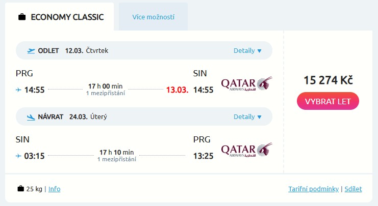 Máš rád lety v maximálním komfortu? Leť na palubě prémiové aerolinky Qatar Airways z Prahy do Singapuru, který je skvělou vstupní branou za poznáváním jihovýchodní Asie. Zpáteční letenky tě vyjdou na 15 274 Kč, kdy v ceně máš i odbavené zavazadlo a full servis na palubě. Vybereš si ze široké palety termínů od února až do listopadu – tak co třeba od 12. do 24. března? Po cestě tě čeká jeden pohodový přestup na letišti v Dauhá.