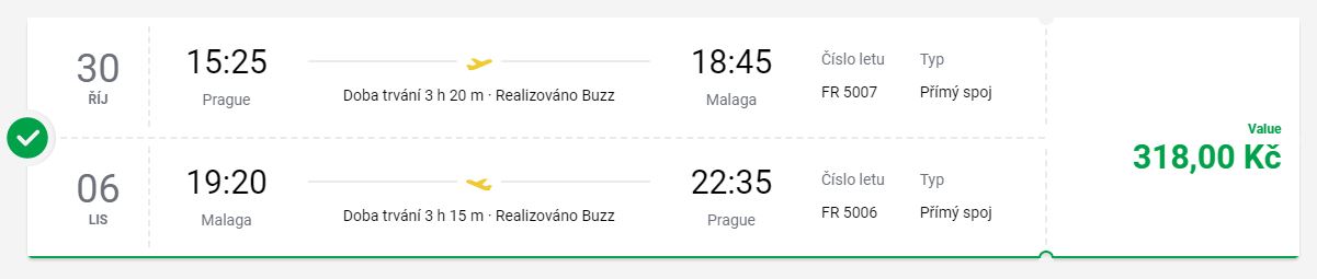 Letecká společnost Ryanair s příchodem zimního letového řádu výrazně proškrtá svou nabídku letů z Prahy (podívejte se, které linky v provozu zůstanou). Jednou z linek, na níž zůstane provoz zachován i v zimních měsících, je ta na trase Praha – Málaga. Spojení mezi těmito městy bude provozováno v rozsahu 2 rotací týdně, přičemž létat se bude vždy v pátek a neděli. Ceny zpátečních letenek z pražského Letiště Václava Havla do jihošpanělského města Málaga začínají na 318 Kč. Doslova za pár stovek pořídíte i letenky na prakticky jakoukoliv termínovou kombinaci v listopadu. Letenky na měsíc prosinec potom naleznete v rezervačním systému za ceny pohybující se kolem jedné tisícikoruny.