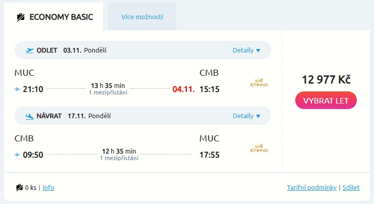 Aerolinka Etihad Airways přichází s parádní akcí na letenky do světa a její jízdu začínáme na nádherné Srí Lance. Zpáteční letenky z Mnichova a Vídně pořídíš za skvělou cenu 12 977 Kč v termínech od října až do března příštího roku – určitě si vybereš, mrkni do kalendářů níže. Co třeba od 3. do 17. listopadu? Po cestě tě vždycky čeká jeden přestup na letišti v Abú Dhabí.