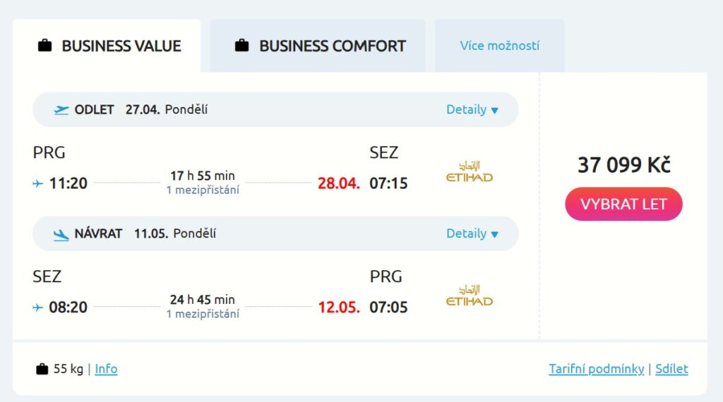 Základní tarif „Business Value“ zahrnuje bezplatnou přepravu odbavených zavazadel s max. úhrnnou hmotností 55 kg. Routing tě v obou směrech povede přes Abú Dhabí (AUH), kde tě čeká jeden klidný přestup na čerstvě zmodernizovaném terminálu. K dispozici jsou termíny během května a června letošního roku.