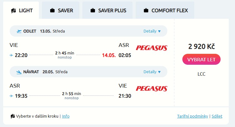 Zažij pohádkovou Kappadokii a proleť se v balonu nad ikonickou krajinou díky aerolince Pegasus Airlines, která nabízí velice pěkné ceny na přímých letech z Vídně do tamějšího města Kayseri. Zpáteční cestu do Turecka pořídíš od fajnových 2 920 Kč, a to v termínu od 13. do 20. května. Další levné letenky jsou dostupné od dubna do začátku června, v září a říjnu, tak si ulov ty svoje.