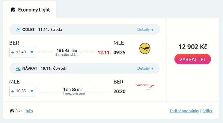 Nekonečné bílé pláže, průzračný oceán, bohatý podmořský život a sluneční paprsky – přesně takové jsou Maledivy. Přinášíme tip na levné letenky s odletem z Berlína, které nabízí aerolinky ze Star Alliance, konkrétně Lufthansa, Swiss a Austrian, jenž pořídíš od suprových 12 902 Kč. Termíny jsou dostupné v závěru roku od konce října do prosince, tak leť do ráje třeba od 11. do 19. listopadu, kdy i využiješ státní svátek. Nejlevnější letenky pořídíš se dvěma přestupy po cestě tam (Frankfurt a Curych) a jedním po cestě zpět (Vídeň), o pětikilo dráž letíš jen s jedním přestupem v obou směrech.