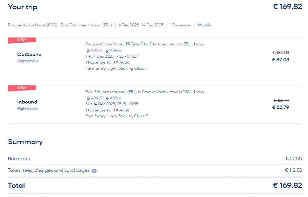 Do konce tohoto pracovního týdne platí promo akce letecké společnosti Aegean Airlines, která nabízí zlevněné letenky do Řecka i dalších obsluhovaných destinací. Velmi pěkným úlovkem shledáváme zpáteční letenky z Prahy (PRG) do Erbílu (EBL) neboli centra Iráckého Kurdistánu, které v rezervačním systému aerolinky ulovíš od 4 229 Kč, a to např. v termínu od 4. do 14. prosince letošního roku. Nejvíce levných letenek na tebe čeká během listopadu a právě první poloviny prosince. Méně termínů poté během prvního kvartálu kalendářního roku 2026.