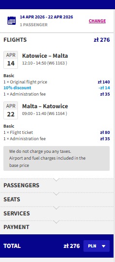 Chybí ti vitamín D a máš dobře dostupné letiště v polských Katovicích? Pokud ano, využij nabídky aerolinky Wizz Air a zaleť si na prosluněnou Maltu! Zpáteční letenky jsou tvoje od 1 583 Kč a klasicky platí, že na nejnižší ceny dosáhnou pouze členové Wizz Discount Clubu. Tak si vyber některý z termínů od března do června – třeba od 14. do 22. dubna a vychutnej si Maltu mimo sezónu.