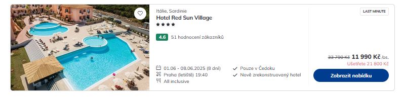 Co s prvním červnovým týdnem? Vyraz na týdenní dovolenou vstříc středomořskému ostrovu Sardinie. V nabídce last minute zájezdů cestovní kanceláře Čedok na tebe čekají taktéž zájezdy z Prahy na Sardinii, a to za skvělou cenu 11 990 Kč. V jejím rámci tě čeká týdenní ubytování na severním pobřeží ostrova – ve vybraném čtyřhvězdovém hotelu s all inclusive (případně plnou penzí plus). Předpověď počasí pro příští týden na severu Sardinii slibuje teploty vzduchu šplhající téměř k 30 °C a teploty vody pohybující se kolem 22 °C. Odlet je naplánován na nedělní podvečer, díky čemuž si zvládneš během víkendu i pohodlně sbalit.