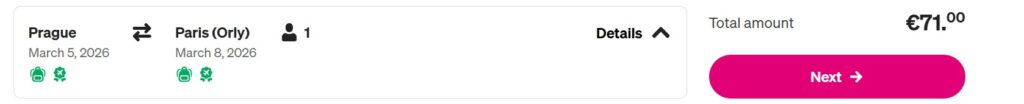 V ceně máš jeden příruční bágl o rozměrech do 40 × 30 × 20 cm. Větší kabinové zavazadlo si přikoupíš od 851 Kč za směr a odbavený kufr do 15 kg tě vyjde od 973 Kč v jednom směru.